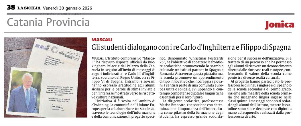 L’istituto comprensivo “Mascali” ha ricevuto risposte ufficiali da Buckingham Palace e dal palazzo della Zarzuela. In seguito all’invio di messaggi di auguri indirizzati a Re Carlo III d’Inghilterra, sovrano del Regno Unito, e al re Filippo IV di Spagna. Entrambi i sovrani hanno espresso gratitudine agli alunni siciliani per le parole di stima inviate per l’interesse mostrato verso le rispettive culture nazionali. L’iniziativa si è svolta nell’ambito di eTwinning, la comunità dell’Unione europea per la collaborazione tra scuole attraverso le tecnologie dell’informazione e della comunicazione. Il progetto specifico denominato “Christmas Postcard 25”, Ha l’obiettivo di abbattere le frontiere scolastiche promuovendo lo scambio culturale tra istituti partner in Spagna e Romania. Attraverso questa piattaforma, la scuola promuove un apprendimento del tipo innovativo che incoraggia i giovani a sentirsi parte di una comunità europea unita e solidale, sviluppando al contempo competenze digitali e linguistiche essenziali per il loro futuro. La dirigente scolastica, professoressa Marisa Brancato, che sostiene con determinazione l’importanza dell’intercultura come pilastro della formazione degli studenti, ha espresso grande soddisfazione per il successo dell’iniziativa. Si è trattato di un percorso che ha permesso agli alunni di ricevere un riconoscimento diretto dalle due case reali europee, confermando il valore della scuola come ponte tra diverse realtà culturali. Al progetto hanno partecipato le professoresse di lingua inglese e di spagnolo della scuola secondaria di primo grado, insieme alle maestre della scuola primaria che insegnano lingua inglese nelle classi quinte. I messaggi sono stati redatti dagli alunni dell’Istituto, mentre le cartoline sono state decorate con dipinti a mano ad acquarello realizzati dalla professoressa di arte.